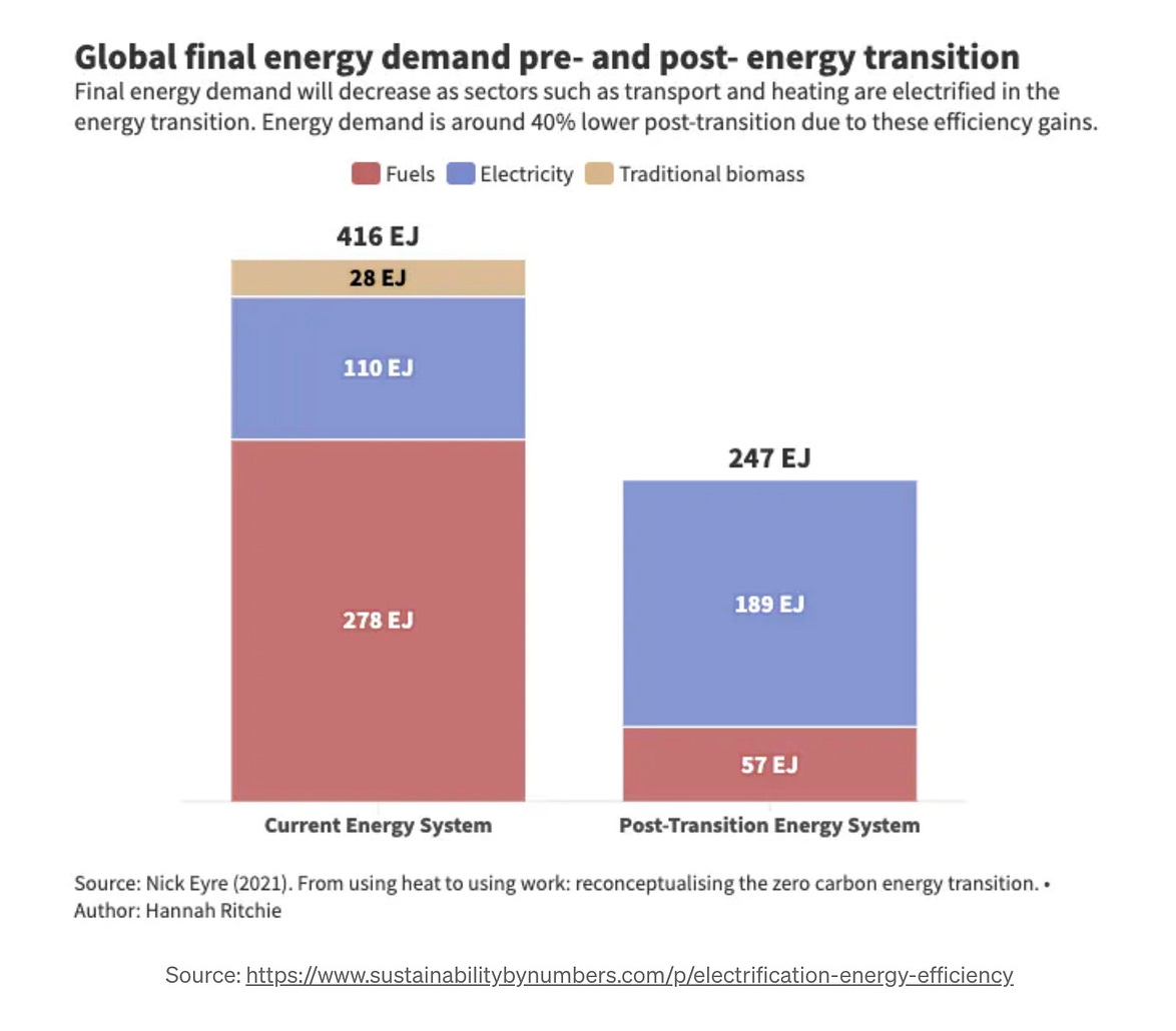 Riding Wright’s Law down Electric Avenue - “Electrification is efficiency - When we electrify our energy systems, a magical thing happens: large inefficiencies vanish. As the International Energy Agency puts it: “Electrification is efficiency”. In a decarbonised world, our final energy demand is much lower than it is today. A study by the Oxford Professor Nick Eyre suggests it’s about 40% lower. This is shown in the chart below. It plots global final energy demand today compared to a ‘post-transition’ energy system where suitable sectors are electrified, and the rest is fuelled by hydrogen. Electricity demand does increase – from 110 to 189 EJ, but total energy demand drops from 416 to 247 exajoules (EJ).”