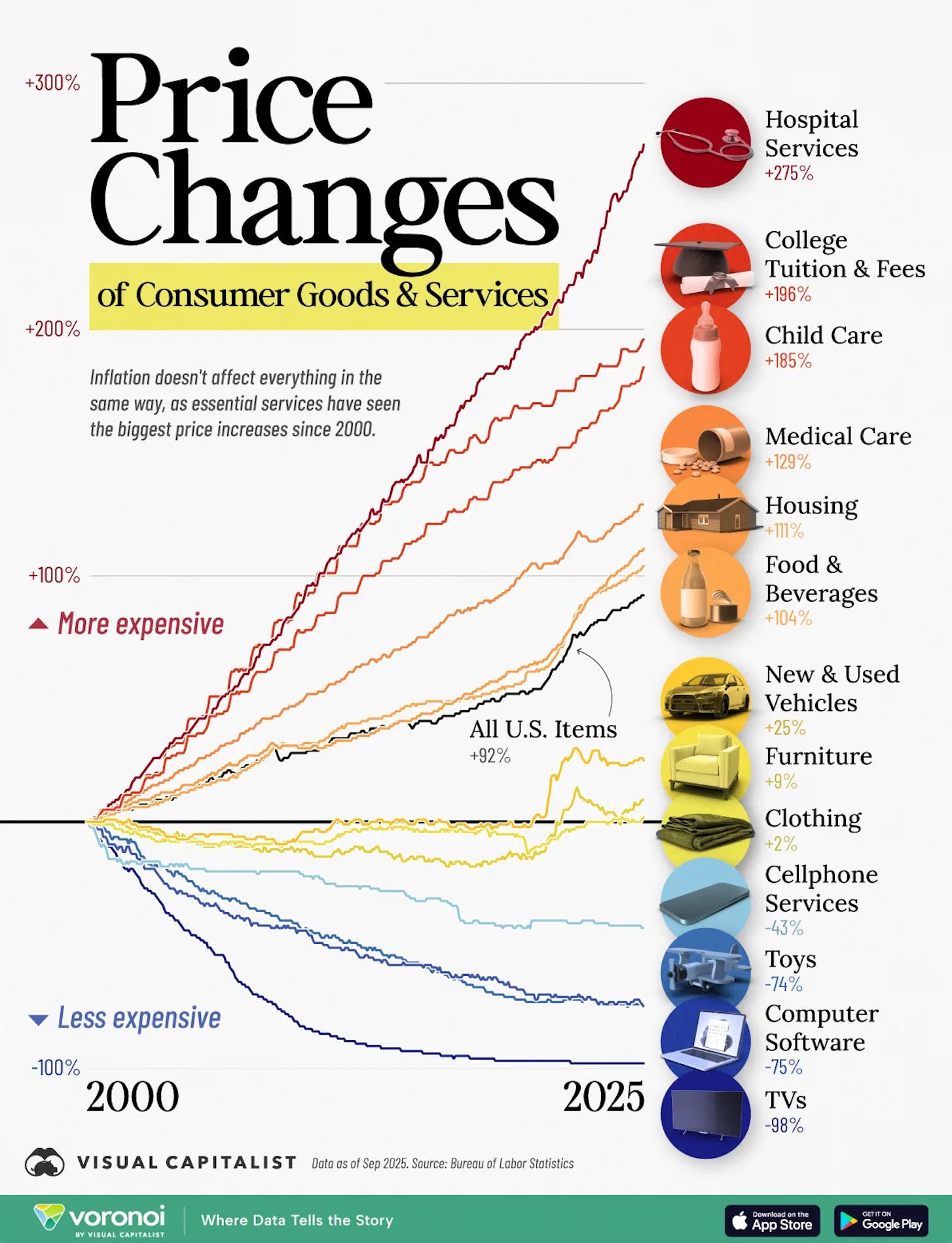 US Inflation - A Tale of Fire and Ice, with the Fire Roaring since 2000 - Overall U.S. inflation has increased 92% over the past 25 years. The cost of many essentials, like hospital services, childcare, medical care, housing, and even the cost of food, are rising at a faster rate than inflation overall. Meanwhile, the cost of technology (software, TVs, toys) is generally becoming cheaper on a relative basis. Hospital services have consistently outpaced inflation over the past several decades, with costs rising a stunning 275% since 2000. For perspective, hospital services increased 6.9% annually as of June 2024, faster than nursing homes (6%), prescription drugs (2.4%), and overall inflation (3%). Today, nearly one in five dollars spent in the U.S. economy goes toward health care, up from one in 20 in 1960. More broadly, prices for essential services have significantly outpaced overall inflation, fueled by consolidation and labor-intensive operations. College tuition and fees have also skyrocketed, rising 196% since 2000. Driving up costs are the hiring of more faculty and increased spending to attract students. Additionally, state funding has seen a long-term downtrend, meaning that colleges must rely more on tuition. As we can see, housing inflation has jumped 111% compared to a 92% increase for all U.S. items. When interest rates hovered near 0% in 2020, it turbocharged housing demand, leading prices to spike to multiple record highs, even as interest rates increased. On the other hand, software has seen a clear deflationary trend, driven by the rise of cloud computing and subscription models. Furthermore, TV prices are 98% cheaper than they were at the turn of the century, thanks to technological advancements and rising manufacturing efficiency.